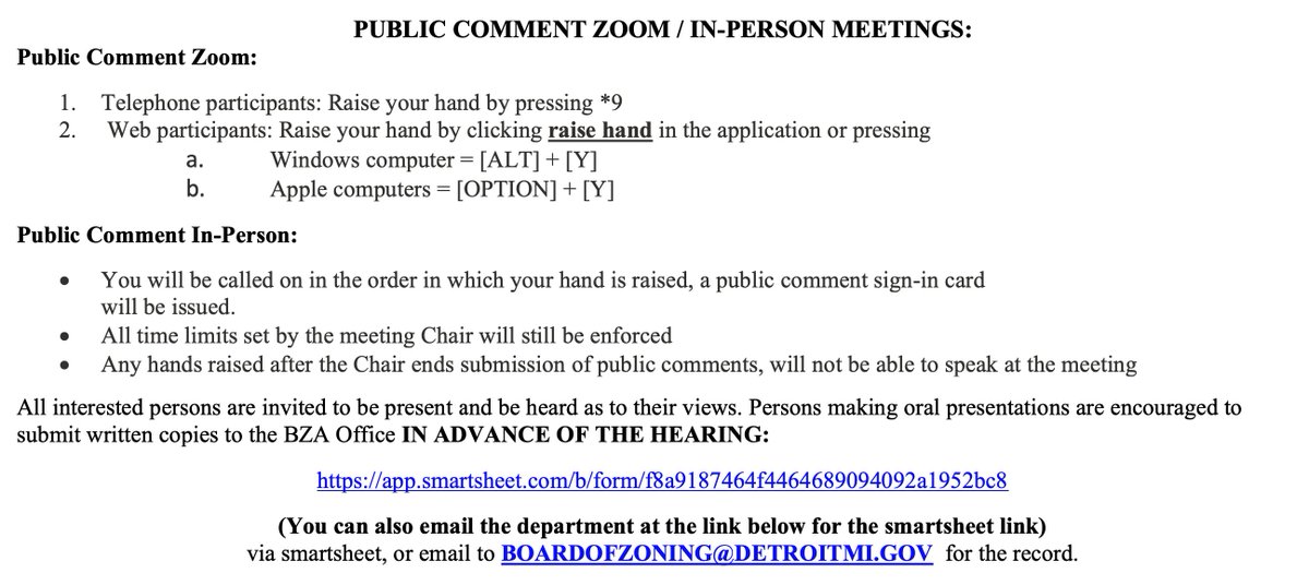 @DetDocumenters Female Public Commenter: When it comes to letters of recommendation, public comments are not being included in the documentation. Response from Board: When it comes time for BZA hearing, please send to BZA Department directly.