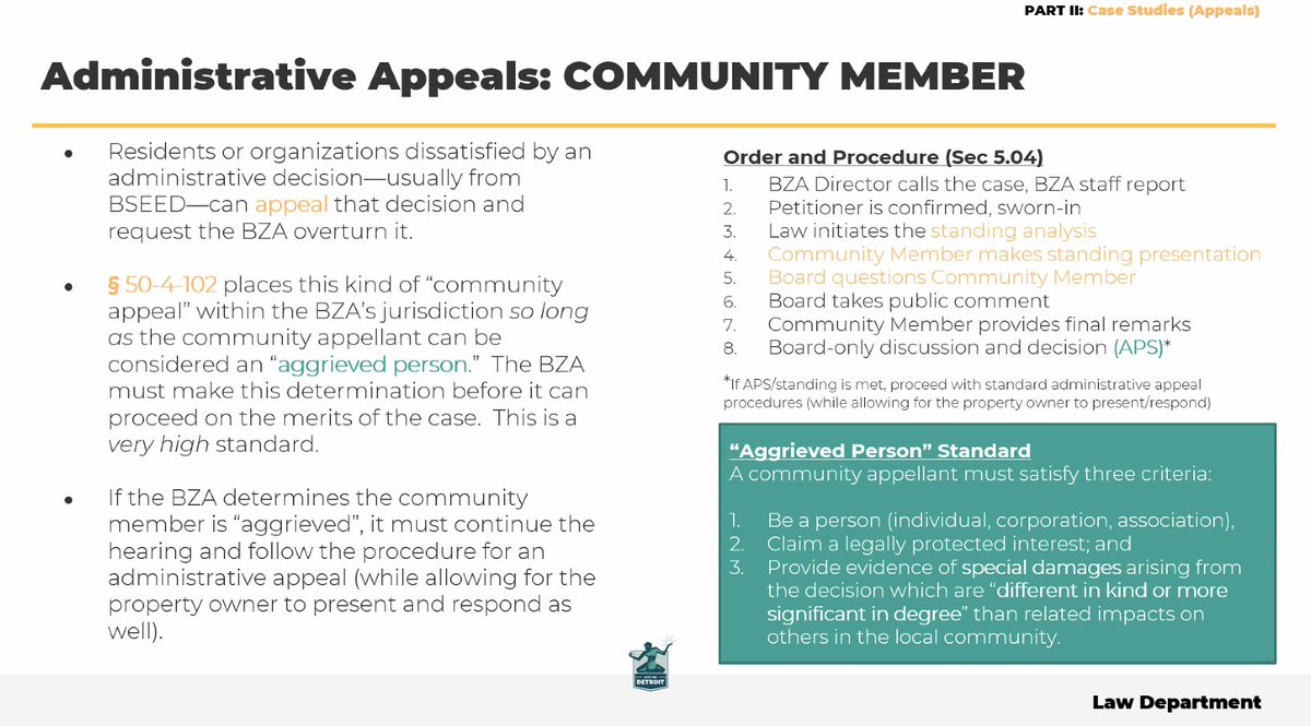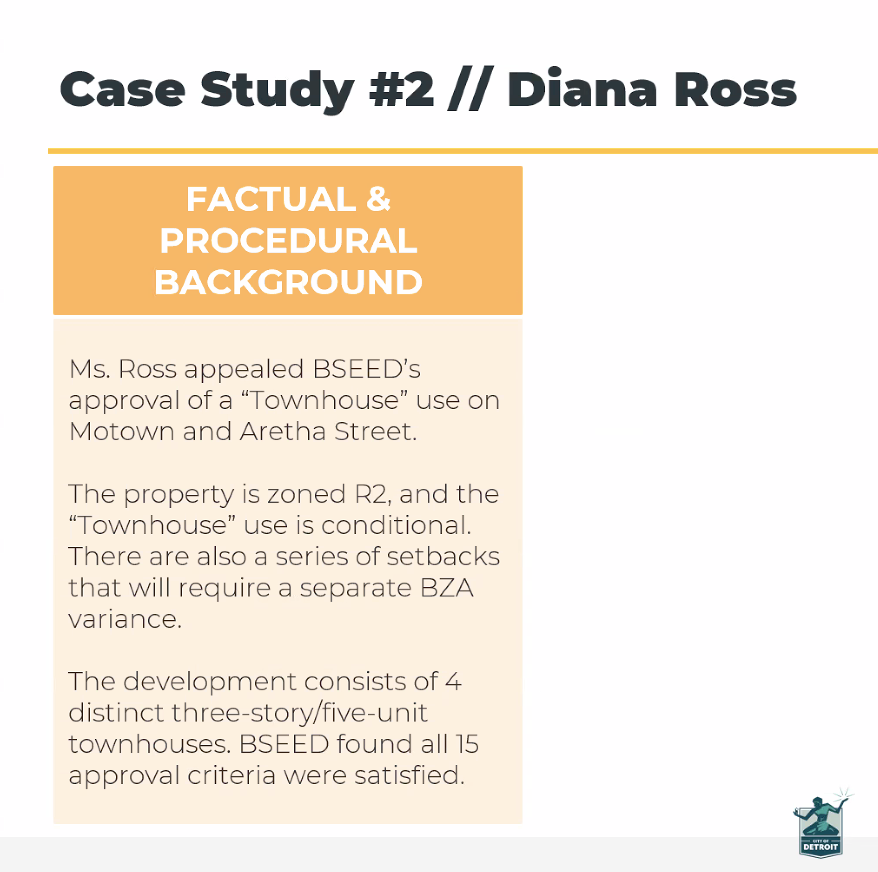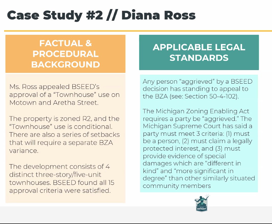 @DetDocumenters OK, now they are on Case Studies. Legal teams are presenting cases to show what the plan was, the appeal was, and how the BZA decided.